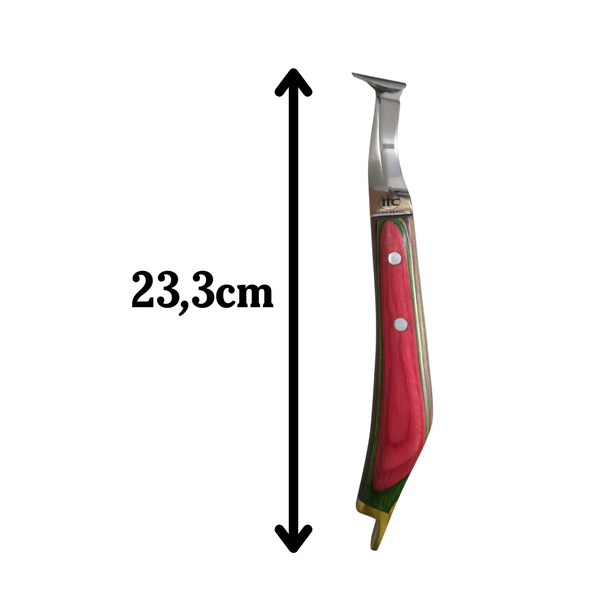 Ferramenta profissional essencial para o manejo de cascos em bovinos, ovinos, caprinos e equinos. Com lâminas duplas e construção robusta, oferece alto desempenho no aparo e nivelamento, proporcionando cortes mais rápidos e precisos.