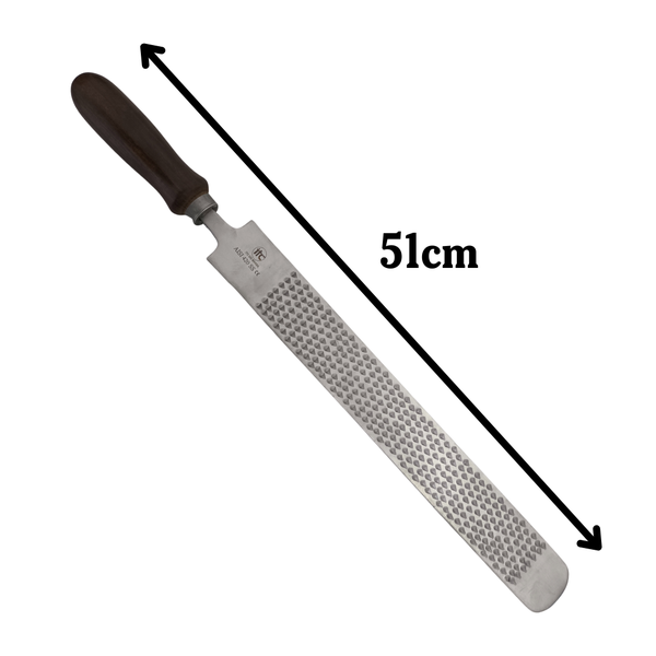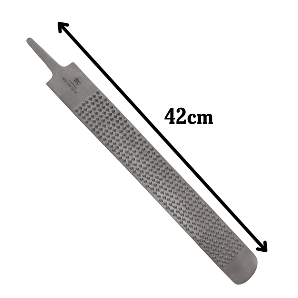 ✔ Face dupla com diferentes picotes — por um lado, dentes verticais (picado grosso) para desbaste rápido; do outro, superfície lisa ou picado fino para acabamento preciso;