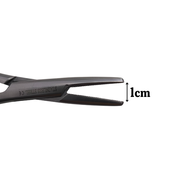 ✔ Ajuste estilo “alicate” — permite segurar com firmeza utilizando o dorso da mão — ideal para sutura rápida e repetida;